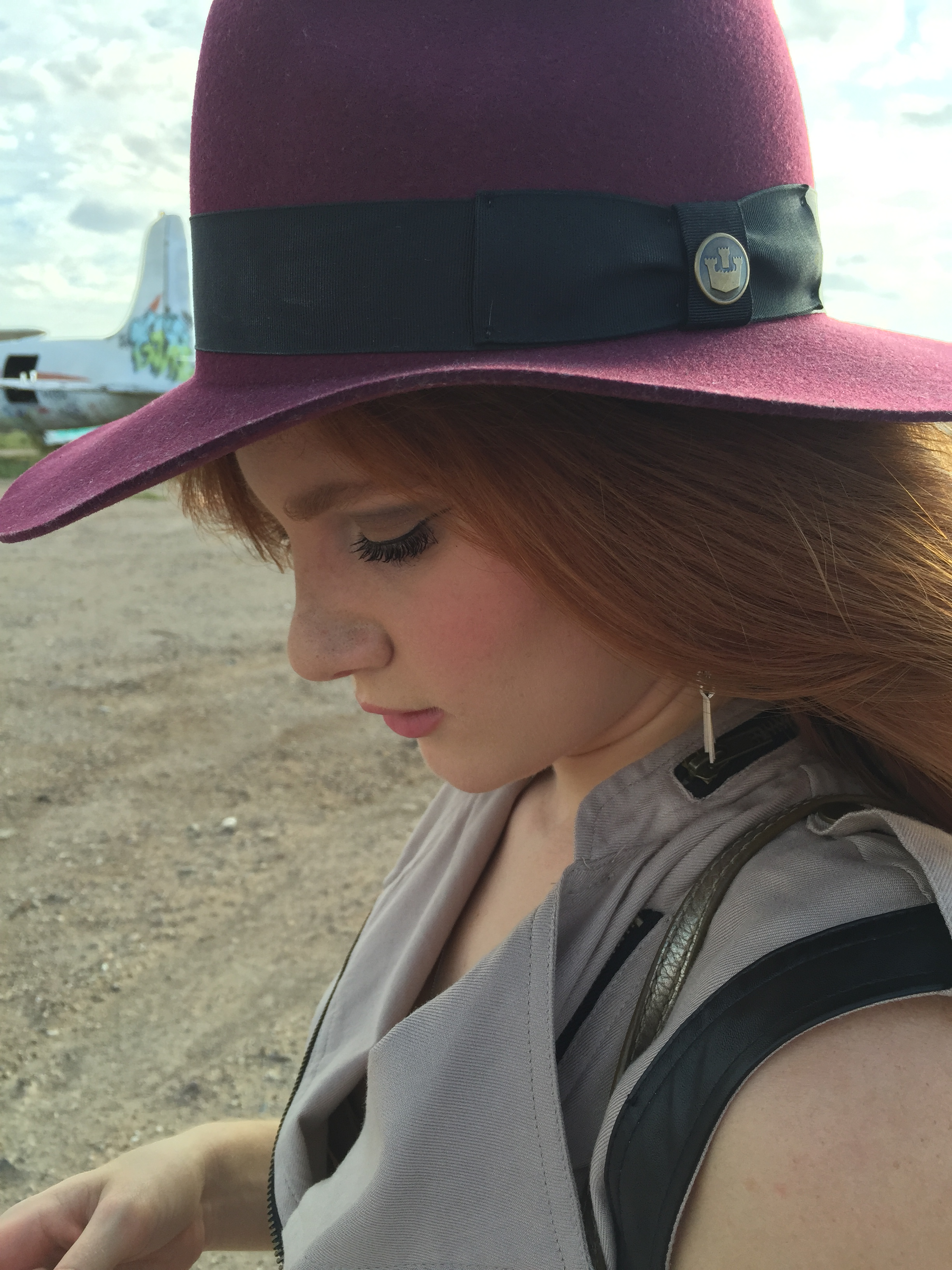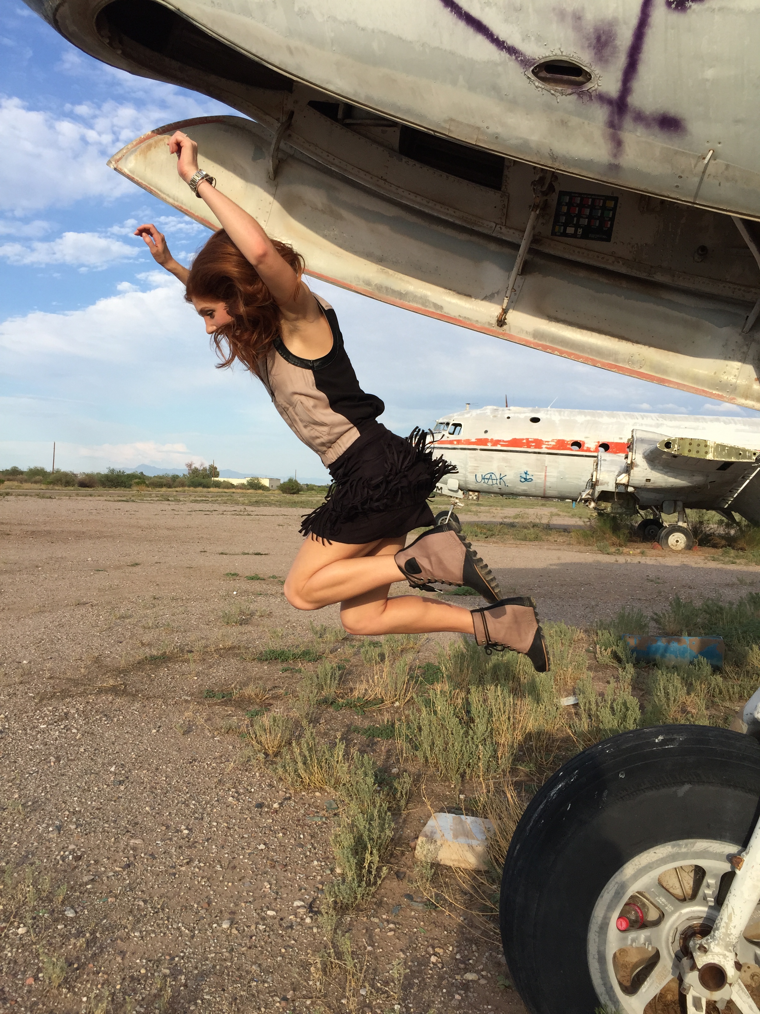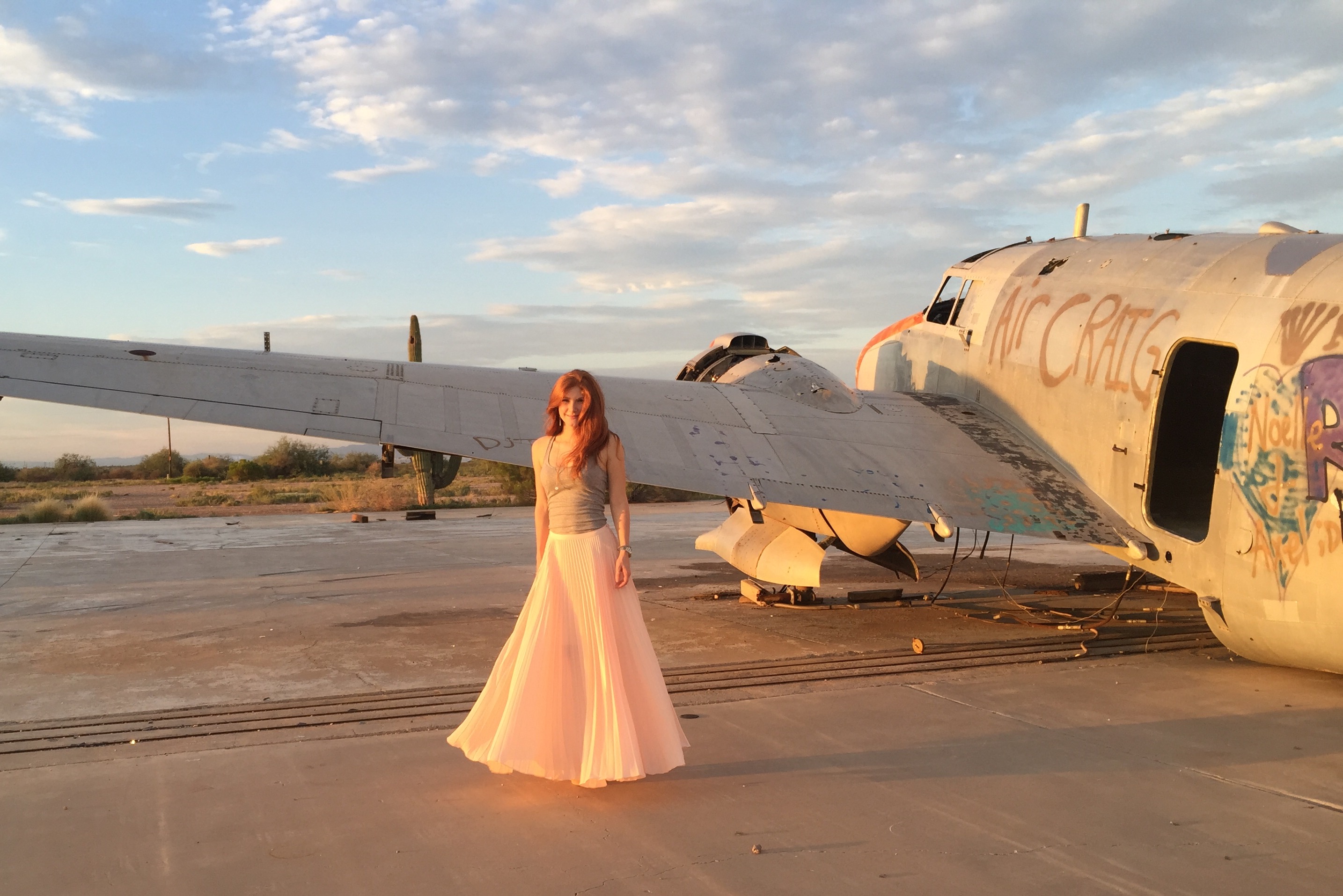 At this really neat abandoned airpark in Arizona there was a redhead graffitied on the side of an old airplane so I simply had to strike a pose with my twin! My favorite thing about this grey skirt is the V in the front. This style is a major trend in skirts this Fall.