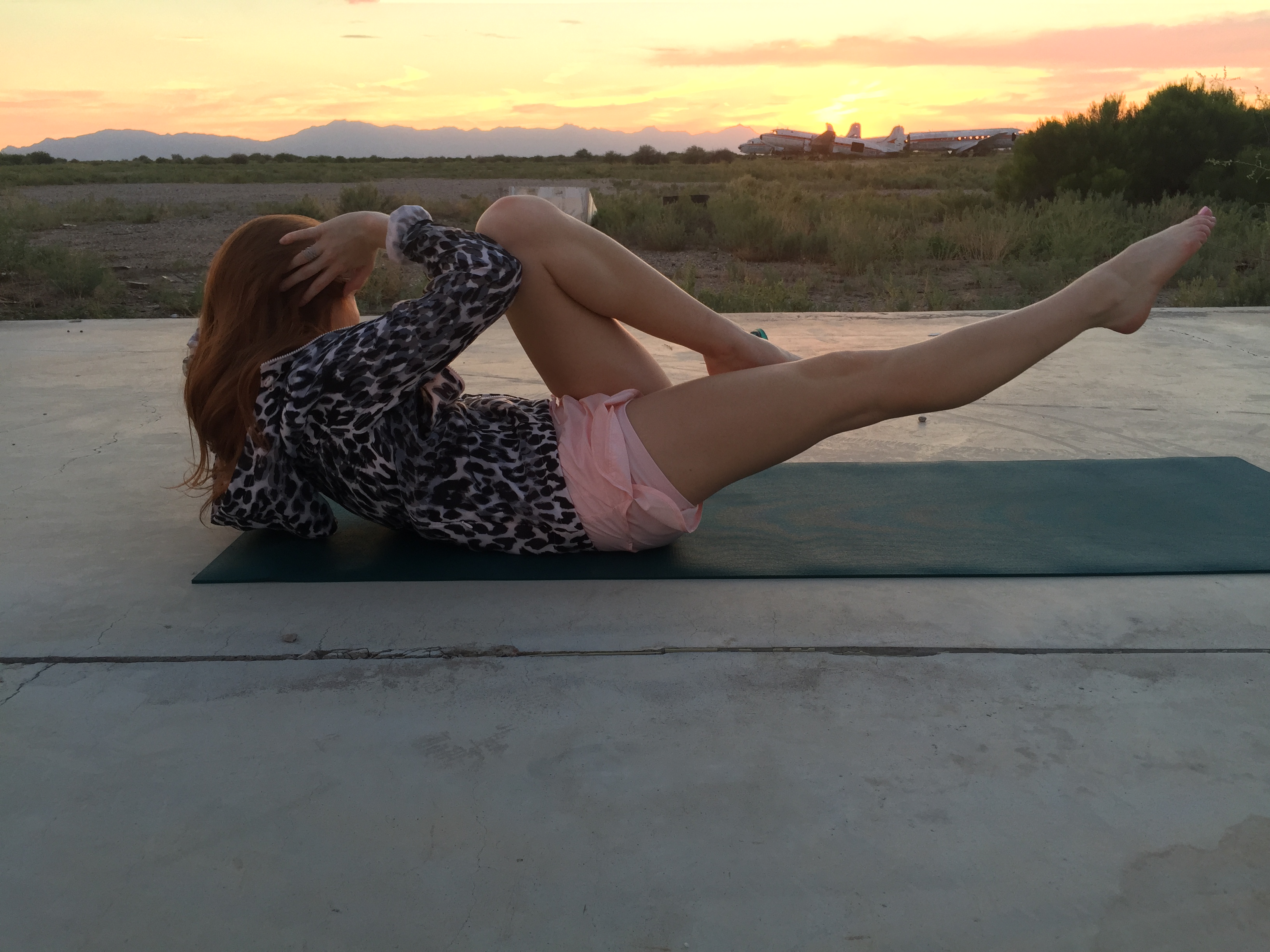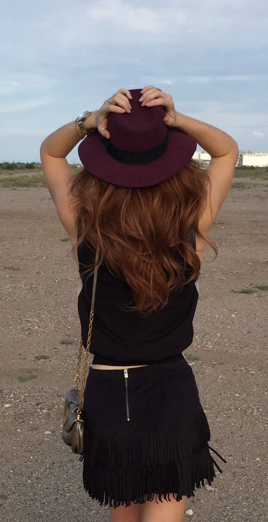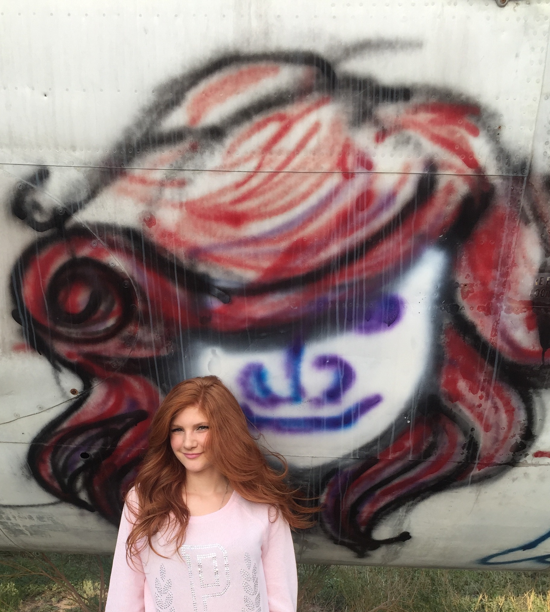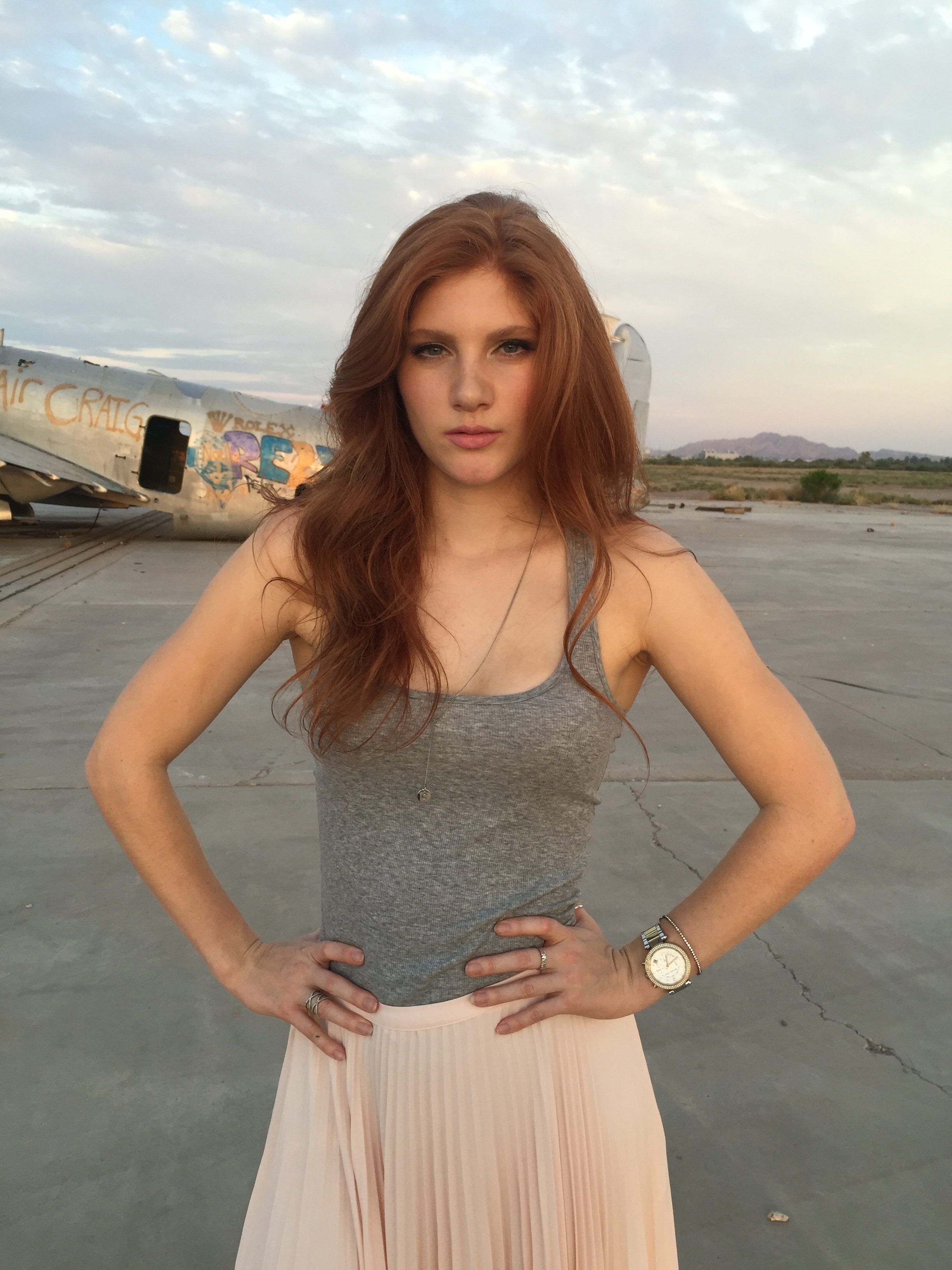 At this really neat abandoned airpark in Arizona there was a redhead graffitied on the side of an old airplane so I simply had to strike a pose with my twin! My favorite thing about this grey skirt is the V in the front. This style is a major trend in skirts this Fall.