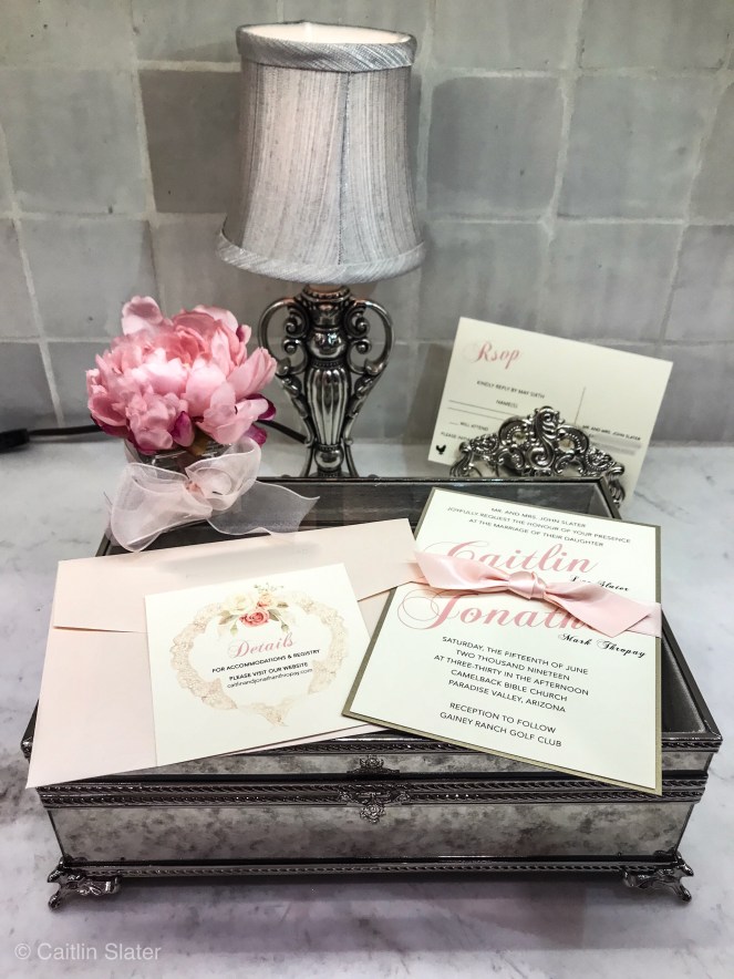 It was so much fun designing the wedding invitations. Definitely, one of my favorite steps in the wedding planning process. And, it truly is a sweet memory stuffing the invitations with my mom. We sat in the kitchen, Michael Buble was playing in the background… We both looked at each other and said, “Let’s take in this moment.”