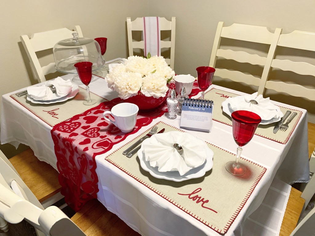 The ‘Love’ placemats are from Home Goods. I got my Valentine’s Day dish towels from Home Goods as well. They have such a good selection there!