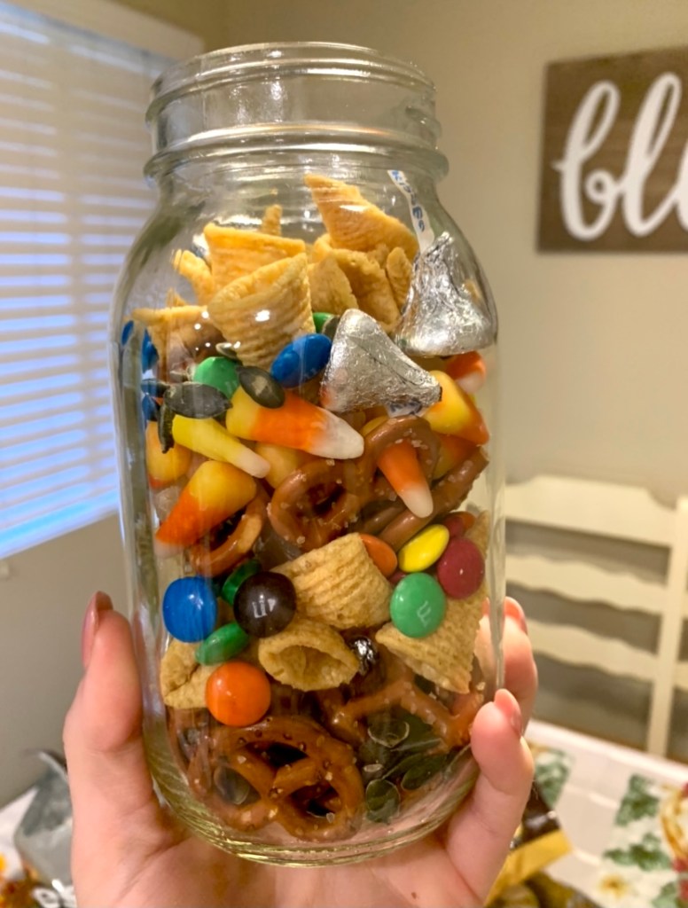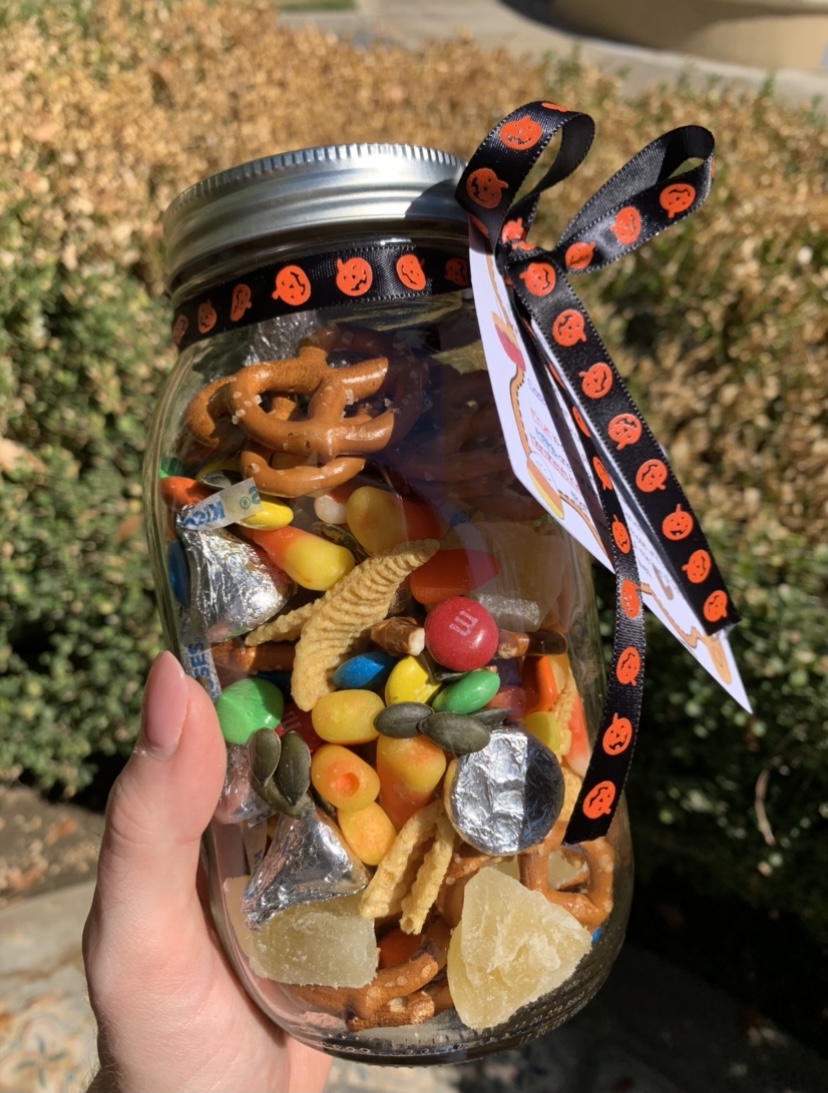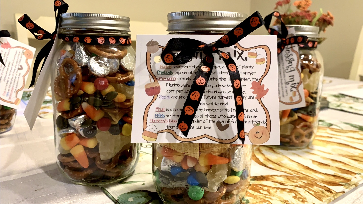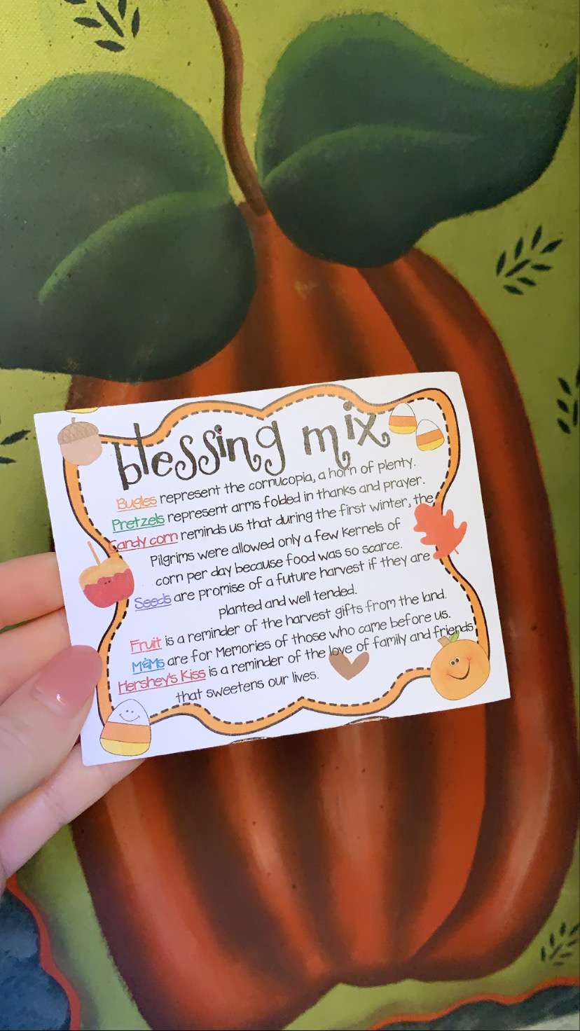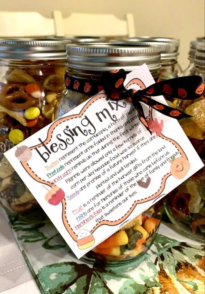 First, I printed out these cute cards. You can find them here or here. For the seeds, I used pumpkin seeds and for the fruit, I used dried pineapple chunks. You can use whatever seeds or fruit you like! I think dried banana chips, dried apricots or mangos would also be great! It’s so easy. Then you all you do is put the Blessing Mix in anything like a cute fall cellophane bag or these Mason jars!