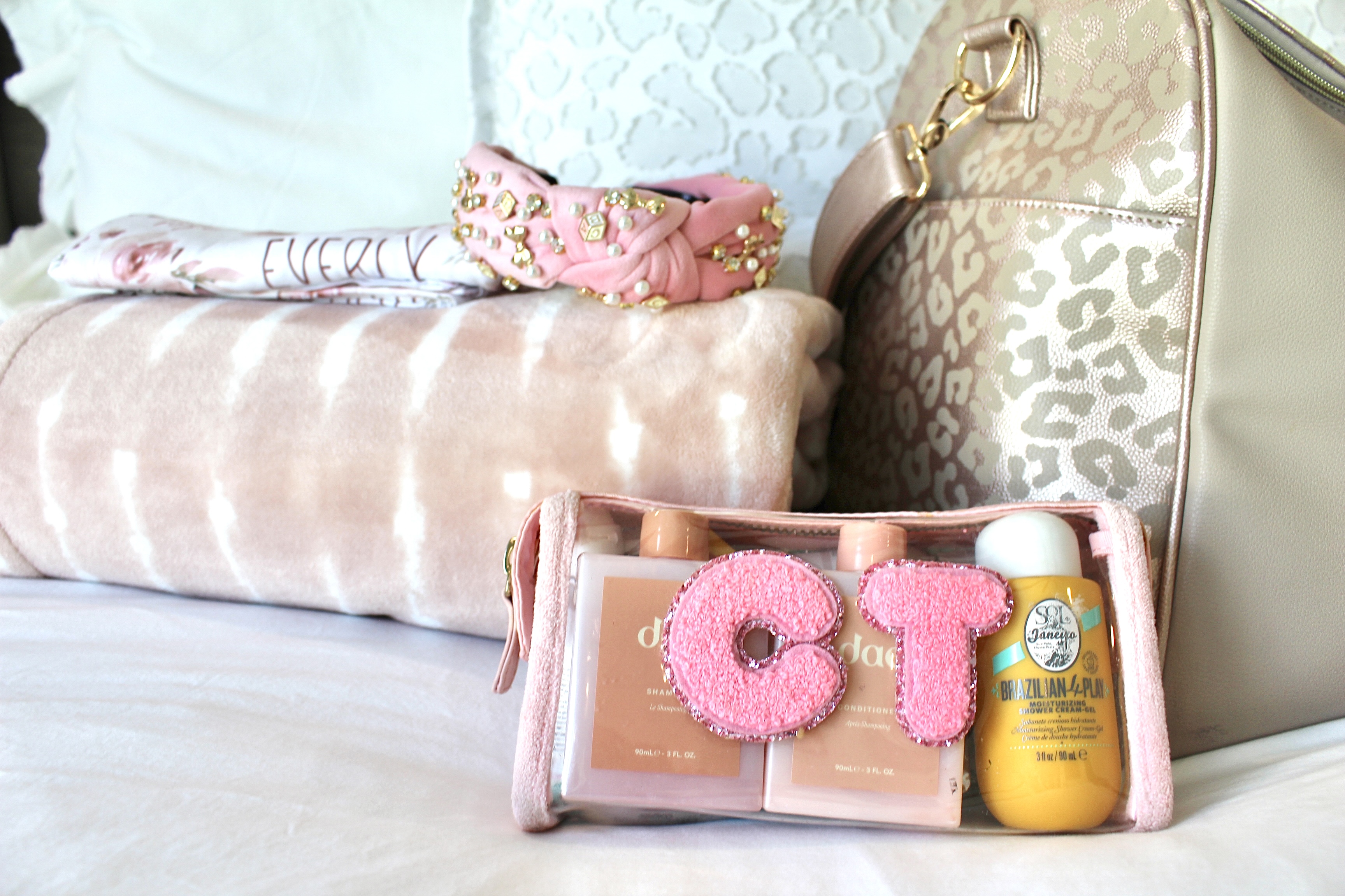 - Toiletries – Things like travel size hair brush, toothbrush, toothpaste, extra contacts, prescription glasses, face wash, deodorant, eye drops, extra hair ties, mini leave-in conditioner spray, mini dry shampoo, and lip balm/favorite lip mask.