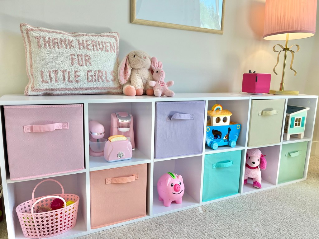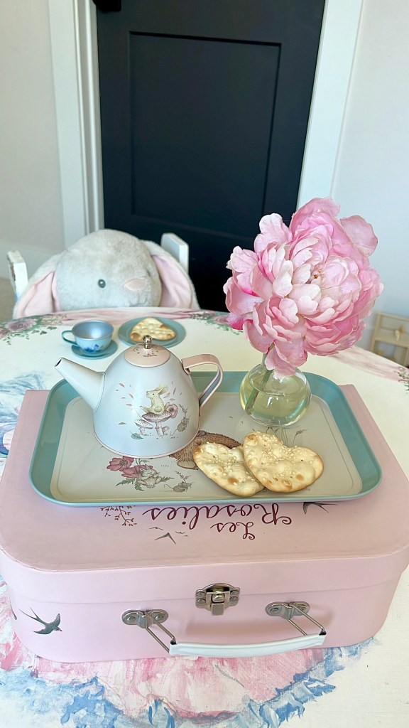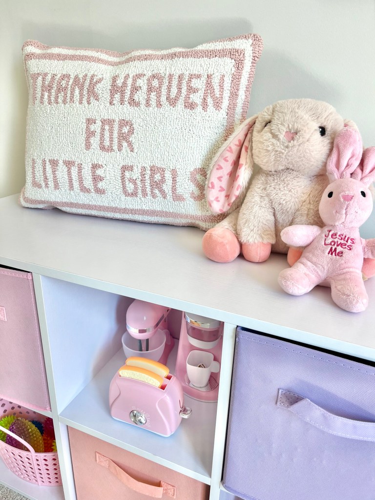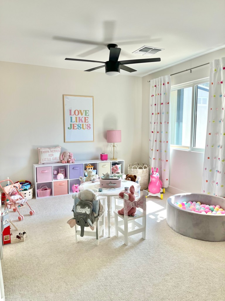Our latest update to the house was adding a playroom and it has been the best decision ever! Everly loves playing in her playroom. It’s the first place she goes when she wakes up in the morning to wake up all of her animal friends. Then, she wants a tea party with her bunnies and bear. She loves pouring them tea (water) and serving them crumpets (aka heart-shaped crackers). I wanted this room to be whimsical and fun and really just a safe place for our girls to play together and make memories together while keeping all of their toys organized in one space.
