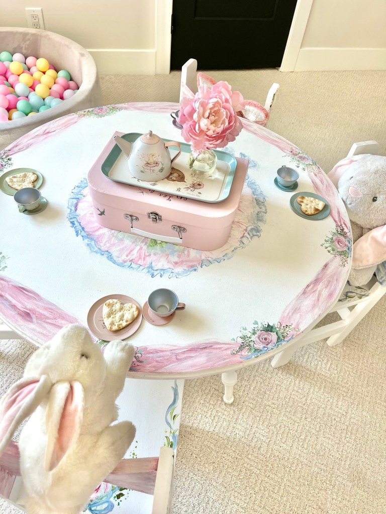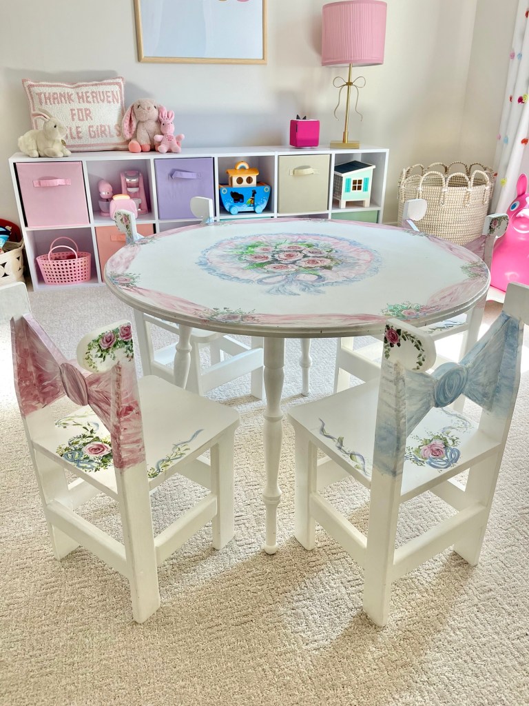 My Papa built this entire table and chairs set and painted it for me when I was little. I have fond memories sitting in those chairs having tea parties. Now, it’ll hopefully be something we pass down to future generations. It’s my favorite part of this room.